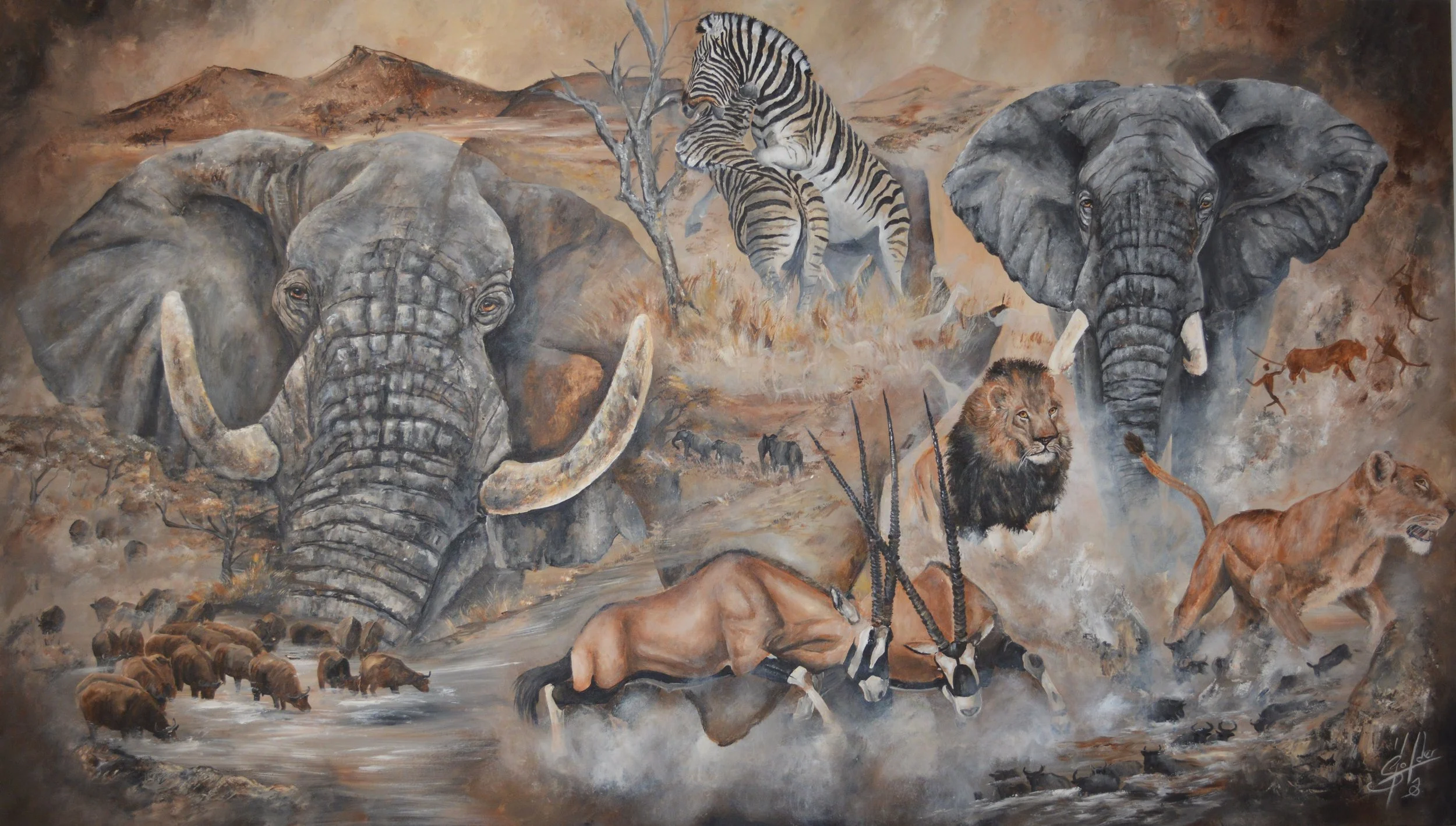WildlifeART Szene ist für mich mehr als ein künstlerisches Genre. Sie ist meine größte künstlerische Herausforderung – und zugleich ihre Vollendung. Ausgehend von einem zentralen Hauptmotiv füge ich unterschiedliche Tierarten, Größen, Dynamiken aus demselben Lebensraum zu einer Gemäldekomposition zusammen.